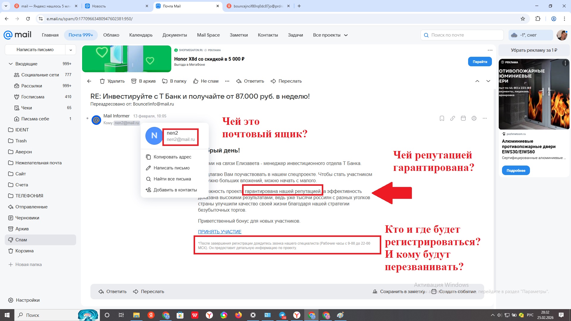 В очередной раз 13 февраля 2026 в 10.05 в спам на [id6311017|Дмитрия Юрьевича Ширшова] личную непубличную почту пришло письмо от якобы инвестиционного отдела Т-банка. Отправитель предлагает поучаствовать в спецпроекте, где не надо больших вложений и якобы можно получать 87 тысяч рублей в неделю.